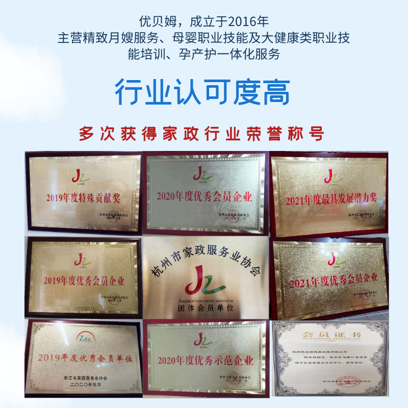 杭州優(yōu)貝姆健康管理有限公司,成立于2016年,是一家致力于打造集定制居家月嫂服務(wù)、孕產(chǎn)護一體化服務(wù)、母嬰健康管理培訓學校為一體的現(xiàn)代化母嬰健康管理企業(yè)。 連續(xù)多年被浙江省家政協(xié)會及杭州市家政協(xié)會評為:“優(yōu)秀會員單位”“家政示范企業(yè)”“特殊貢獻獎”等殊榮。 多次在浙江省家政技能比賽中獲得優(yōu)異成績,并代表浙江省參加“長三角家政技能大賽”并取得優(yōu)異成績。